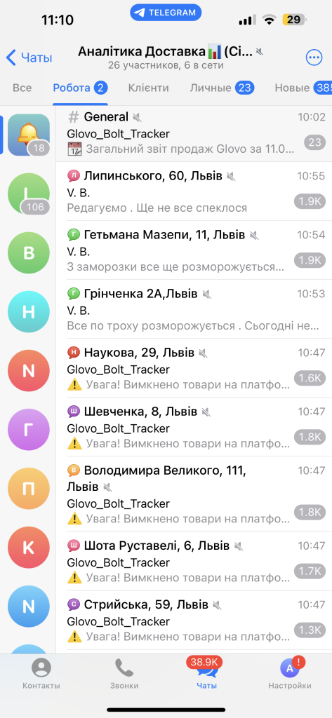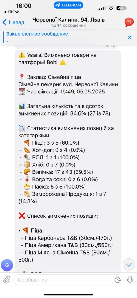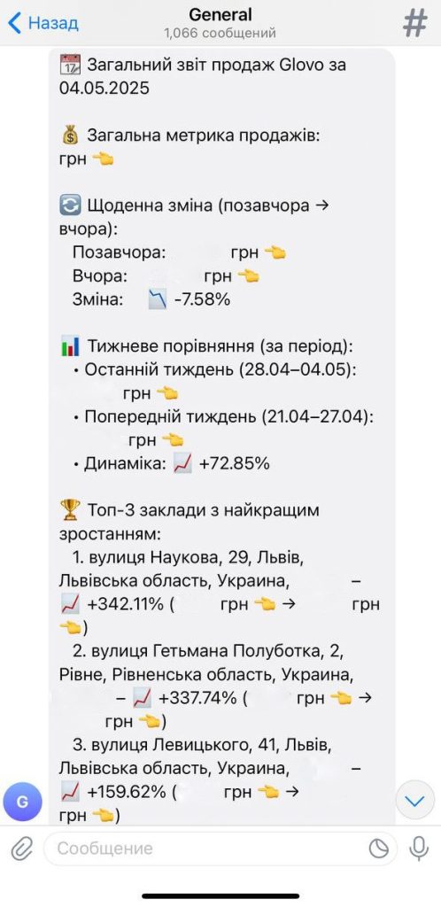 The system scans menus on Glovo and Bolt Food every hour. If an item becomes unavailable, it instantly identifies the restaurant and dish, and notifies the manager via messenger. It also logs performance metrics like sales, delivery time, and revenue.