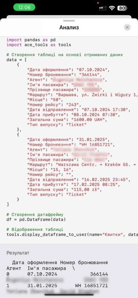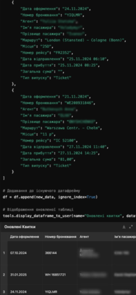 Збирає ключову інформацію – бот витягує деталі рейсу, дати, імена пасажирів та інші важливі дані відповідно до стандартів компанії.